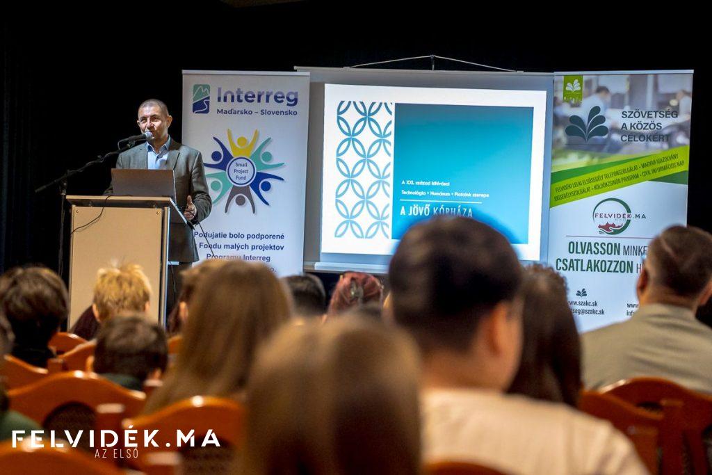 Dr. Horváth Zoltán, a dunaszerdahelyi kórház igazgatóhelyettese a jelen problémáiból indult ki: „Sok baj van a mai kórházakkal is, mégis már a jövőéről kell gondolkodnunk.” Bemutatta az elöregedő társadalom kihívásait, a szakemberhiányt, a mesterséges intelligencia térnyerését („az AI nem azokat fogja kiszorítani, akik használják”), a telemedicinát és a robotsebészetet. Ugyanakkor leszögezte: „Bármilyen okos is a technológia, az emberi érintést, az ápoló és a beteg közötti kapcsolatot nem tudja pótolni.” Figyelmeztetett az egészségügy ökológiai lábnyomára is, amely nagyobb, mint a légi közlekedésé, és sürgette a fenntartható megoldásokat.