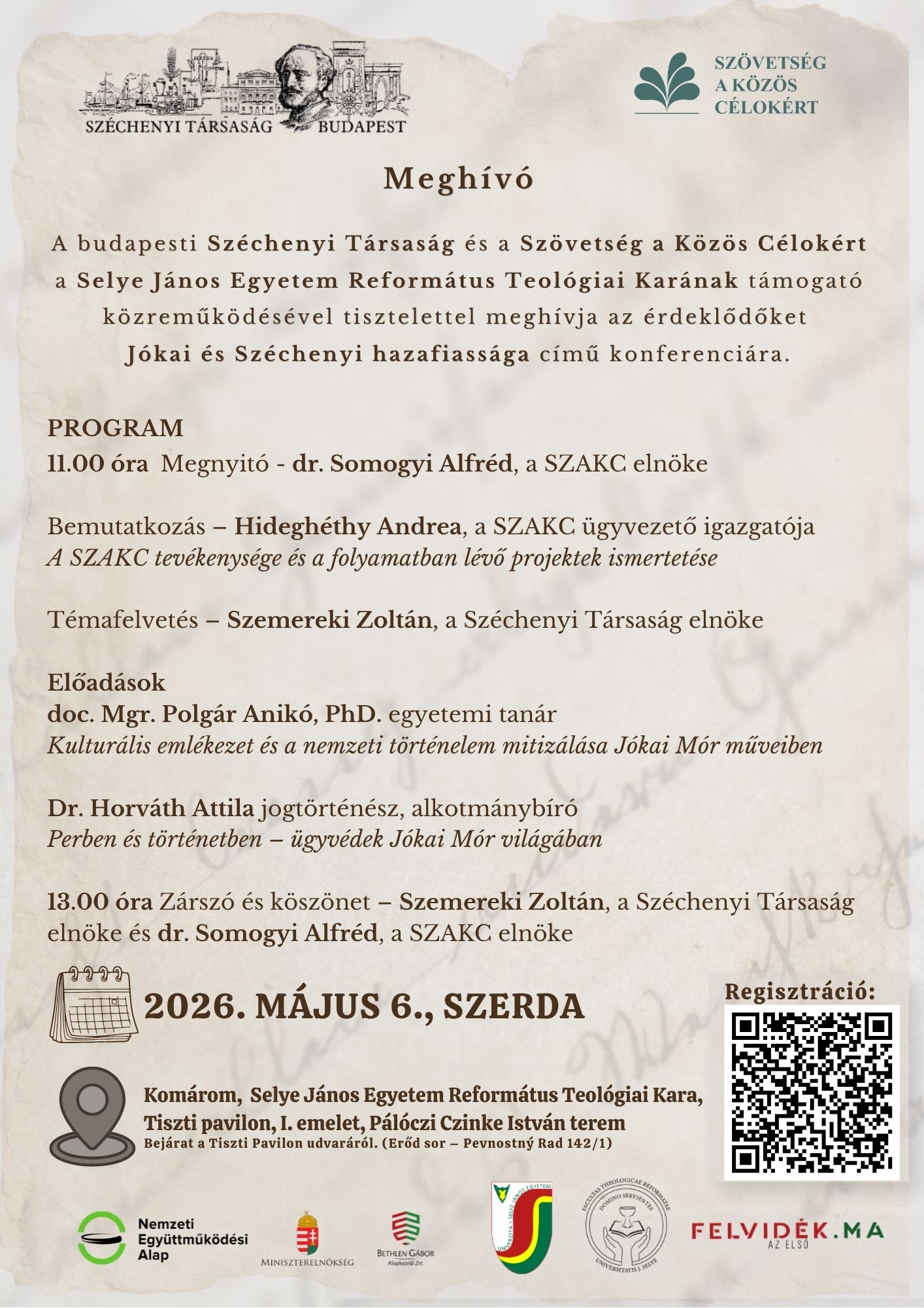A budapesti Széchenyi Társaság és a Szövetség a Közös Célokért a Selye János Egyetem Református Teológiai Karának támogató közreműködésével 2026. május 6-án, szerdán 11 órától konferenciát szervez, amelyre szeretettel meghívják Önt.
